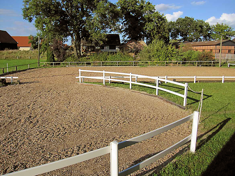 Unmittelbar am Hof wurde ein beleuchteter Reitplatz 20 x 40 m mit Longierzirkel neu aufgebaut. Der Reitplatz besitzt eine zweifache Drainage sowie eine speziell abgestimmte Tretschicht, und kann daher zu jeder Jahreszeit beritten werden.